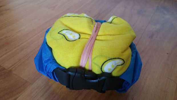 Dentro del bandana amarillento, tengo 2 botellas. Uno es una botella de tabletas de purificación del agua. La otra botella tiene las pastillas de nullifier gusto para eliminar el sabor del yodo después de usar las tabletas de purificación. Tengo una banda de caucho que envuelve el pañuelo para mantenerlo bonito y compacto.