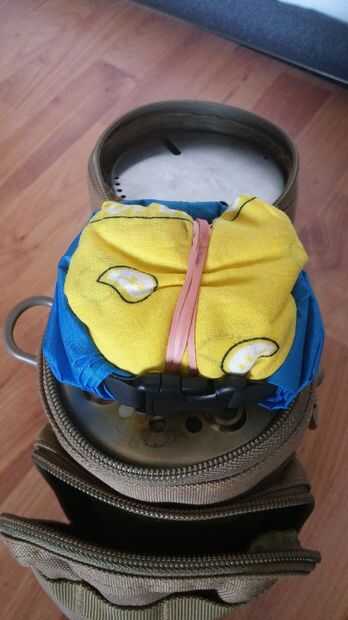 Lo azul alrededor del bandana es una pequeña bolsa seca. Esto tiene algunos usos en y de sí mismo y toma literalmente en ningún sitio. Todo esto anida entre la tapa de la bolsa principal (que tiene las tapas de 2 tazas) y la pequeña estufa. También actúa como una barrera de sonido de las tapas de rebote contra la estufa y llena la forma de la bolsa principal bastante ceñida así que no hay ninguna comba.