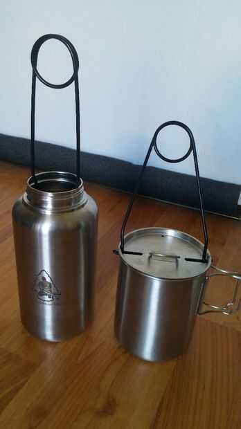 Como se aprecia en el cuadro 2 puede utilizarse para colgar la botella sobre el fuego, o la diapositiva en las ranuras de la tapa del recipiente y en los agujeros laterales en las tazas para que usted pueda colgar su taza sobre un fuego si quieres. La tapa de la taza es bastante ingeniosa. y el agujero lateral es sólo eso. En el lado. Tiene ningunas preocupaciones sobre el derrame de líquidos cuando beben si usas las asas de la Copa.