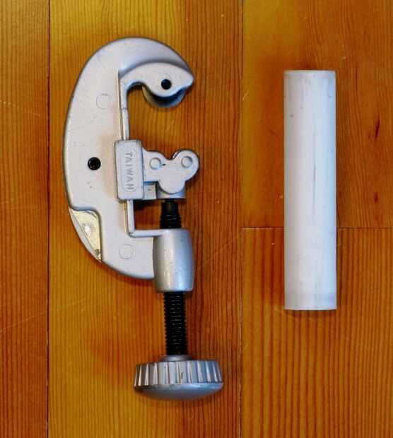 Una forma para cortar tubo de PVC es simplemente con una sierra para metales. Hay varias otras maneras. Ver el Instructable "PVC 101" para un gran discurso de trabajar con tubería de PVC. (Desemejante de la autora de "PVC 101") fuertemente prefiere usar el tipo de cortador de tubo que está diseñado para el cobre de corte del tubo (ver segunda foto). Este tipo de corte lleva sólo un poco de práctica, enroscar con el cortador en la marca; cuidadosamente inscribir un círculo alrededor de la tubería (hacer un círculo, no una espiral!); Atornille ligeramente más apretado; Repita, alrededor y alrededor hasta que se han cortado a través del tubo. Con esta herramienta de corte de la pipa barata, que puede golpear las marcas Spot-On, los cortes serán perfectamente cuadrados y no hay absolutamente ningún polvo de la Sierra! Un cortatubos alicates tipo funcionaría también, pero los recortes no será como perfectamente cuadrado. No importa cómo cortar el tubo, Alise los bordes luego.