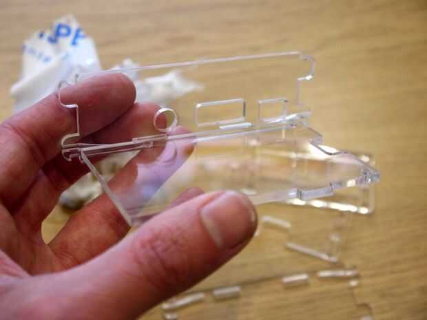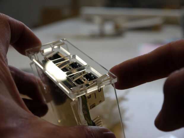 Una vez que las partes simplemente sostienen la parte inferior en el lado con los agujeros, deslice el Raspberry Pi en y deslice en el otro lado. Una vez que se trata de un extremo del gancho en los ganchos en la parte superior de la caja y empuje hacia abajo para que clip en los ganchos en la parte inferior y repiten para el otro extremo. Desmontar otra vez empujar las piezas del extremo para arriba y desenganchen de la parte superior.