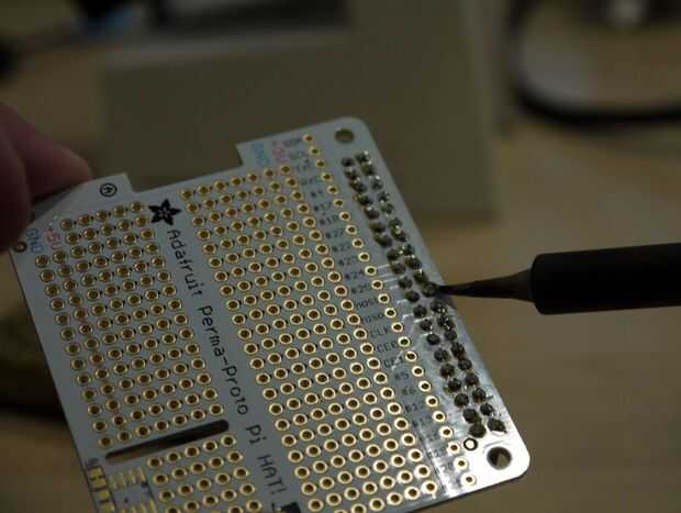 Después que la soldadura en. Si no lo has hecho alguna soldadura antes entonces puedo recomiendo siguiendo uno de los muchos tutoriales en línea. Cuando esté listo simplemente el soldador de estaño, colocarlo de forma que toque un alfiler y el sombrero de Pi al mismo tiempo, aplicar un poco más la soldadura entre el pasador y el sombrero de Pi, cuente lentamente a dos, luego retire el soldador lentamente. Repita para los otros pasadores de 39.