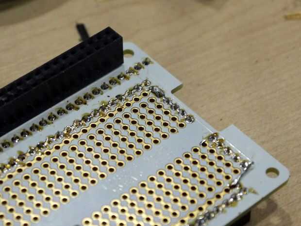 El otro conjunto de encabezados verticales es sólo uno de los pines, para que pueda repetir este proceso, o añadir una cantidad de soldadura a los dos agujeros y dibujarlo a través con el soldador ya que tengo en la foto final.