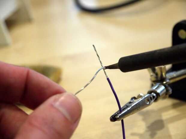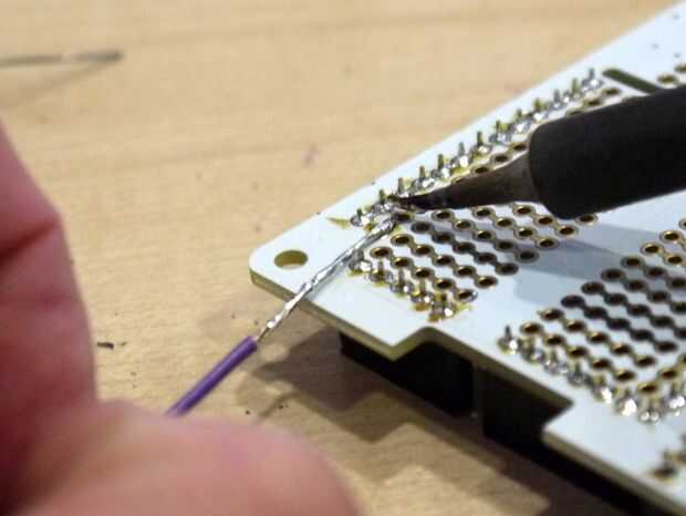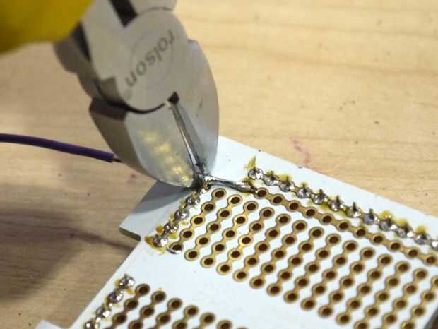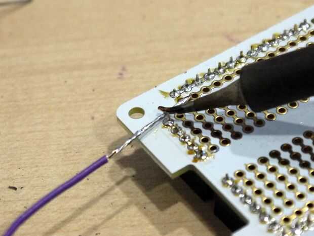 Ahora tenemos que añadir un par de cables para conectar las cabeceras verticales a 5V y GND. Primero tira y una longitud corta del alambre de la lata. También calentar y añadir alguna soldadura en el agujero de 5V más cercano a las patillas de la cabecera vertical. Coloque el cable en la parte superior esta agujeros soldadas, colocar el soldador en la parte superior, espere hasta que la soldadura se derrite y fusibles juntos, entonces lentamente retire el soldador. Repetir con el mismo cable y la parte inferior de la tira vertical final. Luego cortar el cable sobrante.