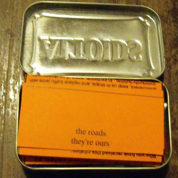 Después de agarrar el resto de los ingredientes, cosas todas en una Altoids lata o cualquier envase elija.  Me gusta organizar los contenidos que hay que profundizar en la lata, conscientemente elegir no utilizar remedios menos controvertidos como una citación, antes de llegar a las cosas serias.  Trozos de tubo de bicicleta pueden hacer un dispositivo conveniente para llevar en el manillar / correa / dondequiera que.  También, asegúrese de que no está construyendo un kit de súper-pesado que nadie siempre llevará en su moto.