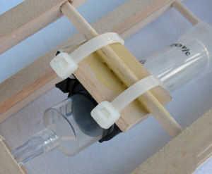 En este momento también puede utilizar otros métodos para ajustar el contacto de la pinza con su base. La imagen de la derecha muestra cómo pueden utilizarse bridas para este propósito. Algunos pueden utilizar colas fuertes o alambres de acero para este propósito. La presión en la pinza es alta y es una buena idea utilizar materiales adicionales para fortalecer su conexión a la base. Esto no necesite si no está probando su elevación neumática con cargas pesadas.
