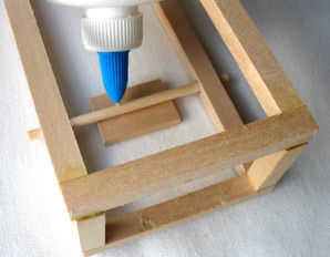 Inserte una clavija de madera en los agujeros del bastidor principal y céntrela. Coloque el bloque de madera plano debajo de la espiga de madera y centro como se muestra. Aplique pegamento en ambos lados de la espiga madera tocar el bloque de madera plano. Deje que el pegamento se seque antes de mover el bastidor principal. Una vez que se pegan el pasador de madera y el bloque de madera plano, puede levantar la base y la madera la vuelta y montar la pinza en él. Tenga en cuenta que la abrazadera tiene una base autoadhesiva. Retire la película protectora de la almohadilla adhesiva y coloque la abrazadera sobre el bloque de madera. Aplique algo de presión para fijarlo. El pegamento en la parte inferior de la abrazadera no es muy fuerte. Es una buena idea para envolver el pinza plana y base bloque de madera con lazo de cable o alambre de acero para la fuerza adicional.