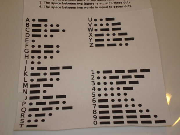 • Imprimir la hoja de código Morse.  Aquí está el enlace: http://en.wikipedia.org/wiki/Morse_code