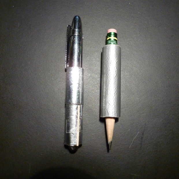 En el lápiz de sí mismo, corte un lápiz de tamaño regular más o menos a la mitad y hace que afilar antes de empezar, porque una vez que la cinta ha sido rodada en la misma, será más difícil de encajar en un sacapuntas. Yo también suelo abajo cerca de la mitad de la goma de borrar, porque creo que necesito borrar todo lo que tanto en una situación de emergencia. Pero, si necesitaba, pude sacar la goma de borrar y usar el metal en la parte superior del lápiz casi como una perforadora o alicate en la herramienta para prensar el metal y hacer una herramienta escopleo con gubia de ella. El borrador también podía ser utilizado como un alfiletero para poner las agujas o una tachuela en.