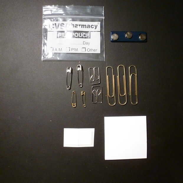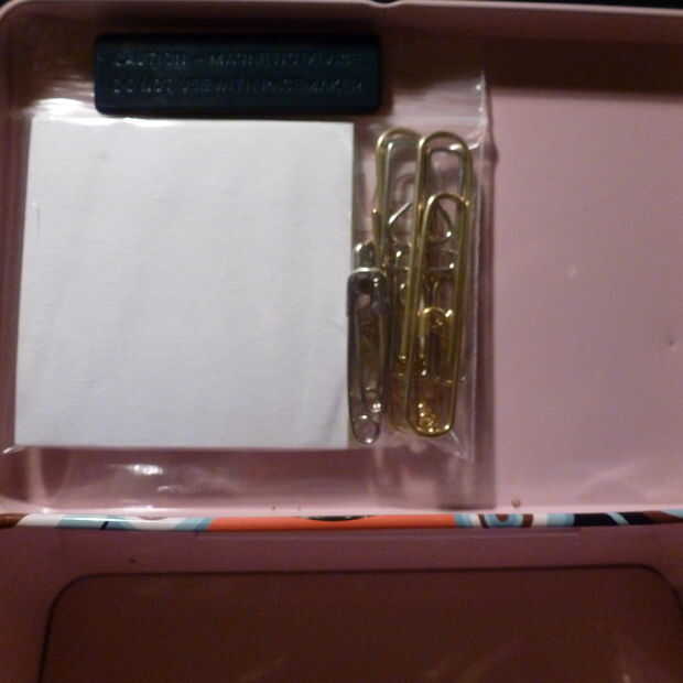 Poner los post-its, clips, UGlu, clips y pasadores de seguridad en la bolsa de la píldora. Use el imán (en la parte superior sobre la parte de "zip" de la bolsa) a este paquete para el "techo" de su lata.