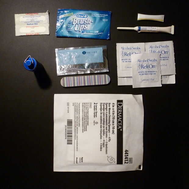 Casi todo que decidí poner en mi equipo particular puede hacer lo más de 1. El tablero de esmeril pueden presentar las uñas, pero también como papel de lija o entablillar un dedo o dedo del pie. Así que, ¿por qué no tienes vendas? Porque ya lo hago. Uno o 2 curitas poco no van a hacer diddly si tiene incluso un corte semi serio. Incluso con cortes poco mina generalmente terminan pelando hasta en los bordes y sólo permanecer en por una hora o 2. Cinta del conducto por sí mismo es un gran vendaje, sin gasa. Para un corte más bien pequeño, yo utilizaría el alcohol torundas y cinta adhesiva sobre el corte para mantenerlo limpio y protegido. Para algo más serio, puedo usar los cierres de mariposa y algunos de la gasa o alcohol Limpie con la cinta del conducto. Si es peor, yo puedo coser con una aguja e hilo, luego cubrir con cinta de Gasa y el conducto. Puedo matar dolor con lo que se esconde en mi caja de la pequeña píldora azul, o detener un ataque de alergia leve. Pones en lo que cree que le ayudará a la mayoría, o lo que es más probable que se utilice. Si yo necesito más vendaje material, puedo utilizar el paño de vidrios y las hojas de repaso sobre el dedo casi toda la longitud, así con alguna cinta alrededor de ella, que es un gran vendaje para el dedo entero, o una manera rápidamente cepillarse los dientes también.