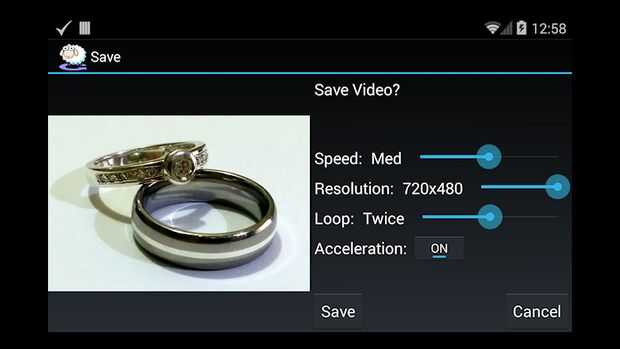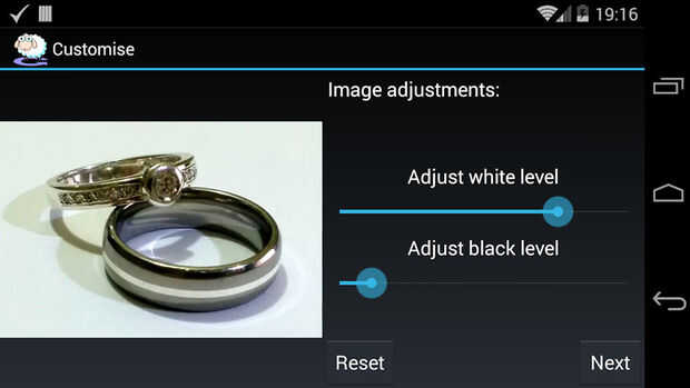 Los menús de la aplicación le permiten ajustar parámetros como el brillo y el contraste (que puede ayudar a quitar fondos blancos o negros) y la velocidad de rotación del objeto y la aceleración.