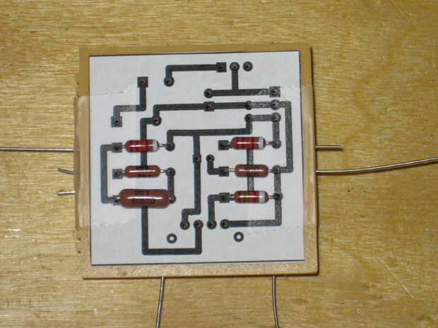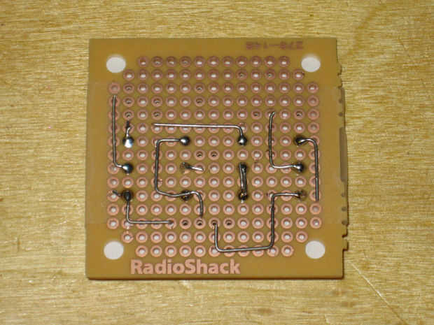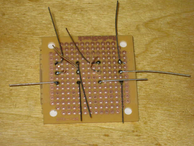 Doble los cables de las resistencias hacia fuera así que no caerá al girar el tablero soldar en su lugar. Cuando se trabaja con protoboard como esta me gusta utilizar los cables de los componentes para vincular a las trazas de un componente a otro. Para que flexión le conduce en la dirección de la componente más cercano se vinculará a es una buena idea.