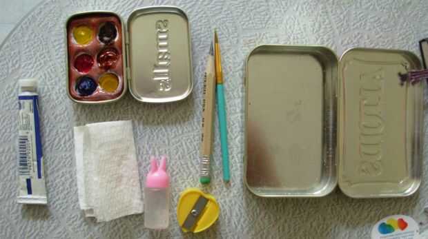 Esto le mostrará cómo convertir una mini lata Altoids en un conjunto de pintura portátil.Para este proyecto necesitarás:1 mini lata Altoids1 ladrillo de la arcilla polimérica (Fimo, Sculpey, etc.)6 pinturas de acuarela líquidas en colores de su elecc