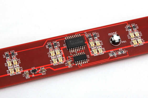 U1 es un regulador lineal 5V. Regula el voltaje de entrada (6-9) a 5VDC que es lo que se requiere para el microcontrolador PIC16F505. U2 es el PIC16F505 microcontrolador. Es un dispositivo flash programable. La parte posterior de las características de la placa PCB expuesto terminales de teclado para que el cliente puede utilizar para desarrollar su propio código para el secuenciador de LED. U3 es una alta corriente Darlington del conductor IC. La lógica de nivel salidas del PIC16F505 y canales de salida de corriente alta para cada uno de los segmentos de LED (8). Cada segmento del LED funciona a 9VDC con corriente dependiendo de resistencias de limitación actuales se utiliza de salida 30-60mA. R3-R18 son actual limitación resistencias que limitan la corriente a través de los LEDs. Corriente de LED típico es 5-15mA. Para este diseño particular, R18 R3 son resistencias de 330 ohmios.