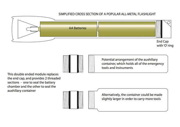 Como digo, dondequiera que toma su antorcha, tiene su kit. Que he descrito en los diagramas de todas las herramientas poco probables que encajarían en la cápsula; como sierras, lineas de pesca y ganchos, cuchillas y abrelatas. Si se aprueba la segunda opción, podría llevarse a la de la cápsula más grande y mucho más. Supongo que la pequeña cápsula se podría hacer un par de centímetros más largos, así como para mayor capacidad. Sin embargo, sería mejor no ir demasiado lejos y que la unidad final demasiado incómodo.