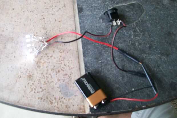 Todos los LED, interruptor y pila de alambre juntos. Utilice una batería de 9 voltios. Voy a explicar por qué más adelante.