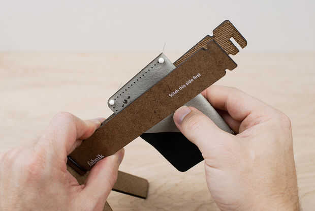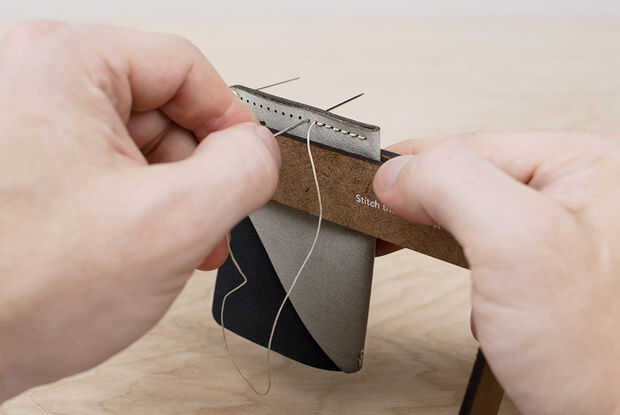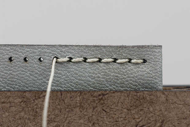 Vuelva a colocar las piezas de cuero en el potro de costura con las clavijas costuras mirando hacia fuera.