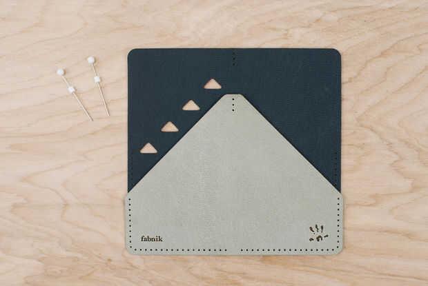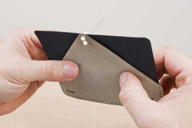 Apilar las piezas de cuero con la pieza gris en el frente, con ambas superficies lisas de frente a usted y con la parte superior tres agujeros alineados. Retire los tapones de los pasadores de costuras e Inserte los pernos en los orificios superior e inferior de la serie de tres orificios.