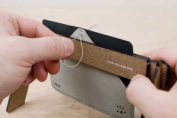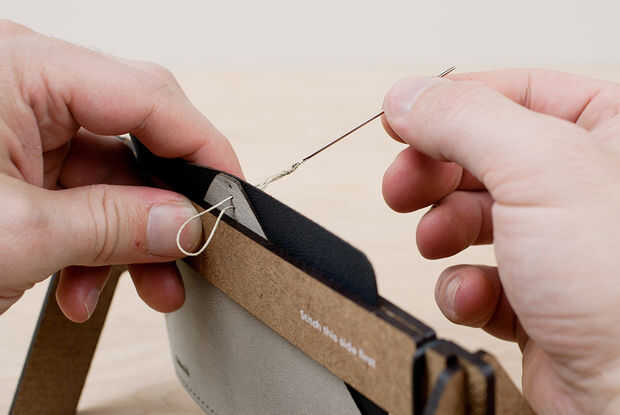 Uno de los bares de pony costura debe etiquetarse "coser este lado primero". Inserte la aguja en el segundo agujero de ese lado y tire de ella a través de todo el camino. Comenzarás en este lado para cada puntada, que creará una costura de aspecto agradable y consistente. La etiqueta ayuda a si pierde la pista.