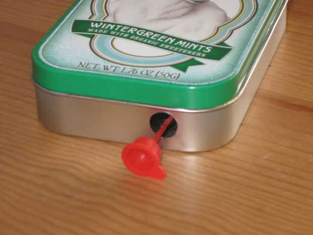 Taladre un agujero para el tapón. El diámetro dependerá del tapón exactos que utilizas, he utilizado una broca de 5/16. Tenga cuidado de perforación esto fácilmente puede hebilla metal, comencé con una broca pequeña y trabajó lentamente, casi sin presionar sobre la cabeza del taladro. El agujero debe ser lo más limpio y redondo como sea posible.