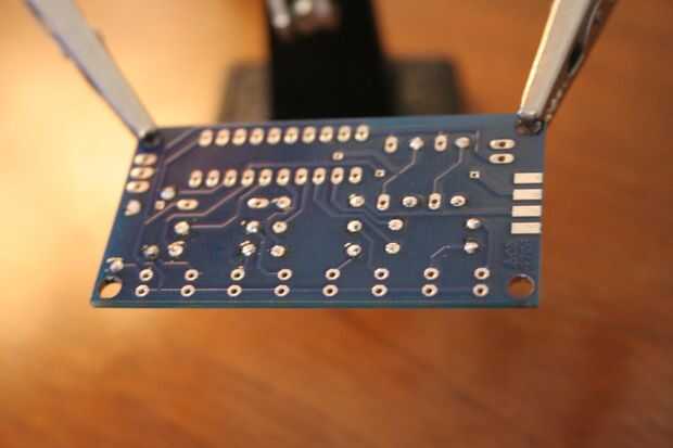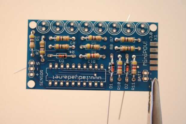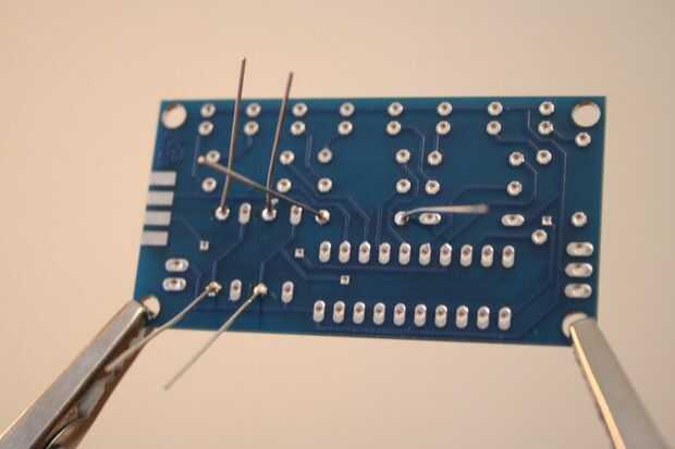 Poner el componente en el PCB en el lado con la escritura, las colas de la curva un poco, voltee la placa y soldar en su lugar. Luego cortar las colas en exceso al inicio. Siga las imágenes y mirar los comentarios.