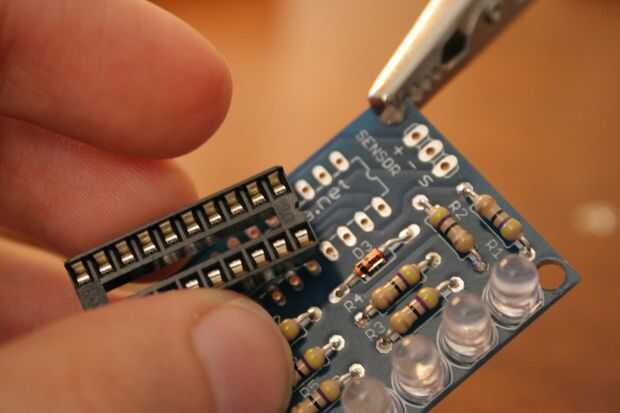 Soldar todo y luego pegar el IC en la parte superior. No olvide también línea de la IC (tiene la "U" se ahogan en él) con el zócalo. Existe un círculo oscuro en la IC, que debe hacer frente el puerto serie cuando orientada correctamente.