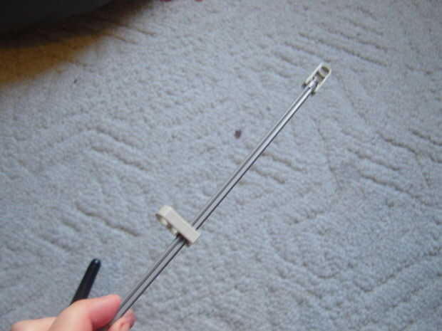 primera curva el clip de papel pequeño en un gancho (si se curva el uno grande no cabrá en la caja) y luego enganche el faseners como se muestra. Esto se convierte en su barra (sí, este kit tiene una varilla) Si desea, puede utilizar una antena de radio, pero creo que las ruinas la spiriet entera de hobo de pesca.