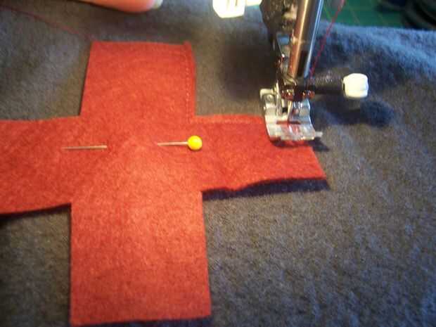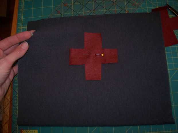 Con la tela (gris) exterior doblada, coloque la Cruz en el centro de lo que será la parte delantera de la bolsa. Despliegue y pin y puntada de la Cruz en el lugar con la máquina de coser con hilo rojo (o puntada de la mano) (o pegarla)