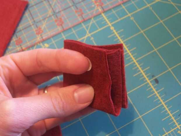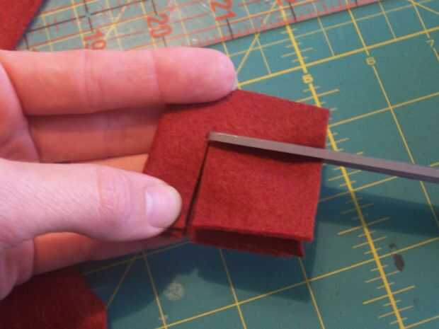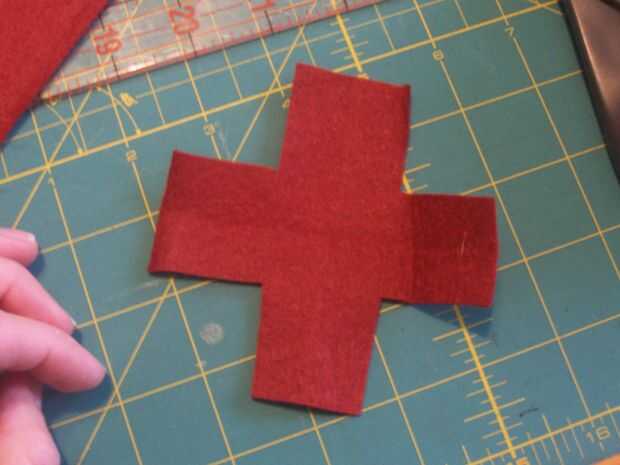 De la tela roja, cortar un cuadrado de 4 pulgadas. Luego doble la plaza en cuartos y cortar los bordes (como se muestra en las fotos) para hacer una cruz.