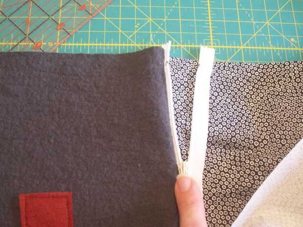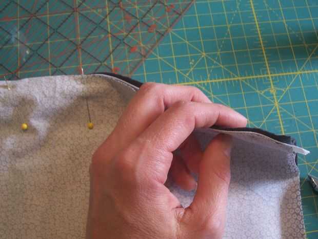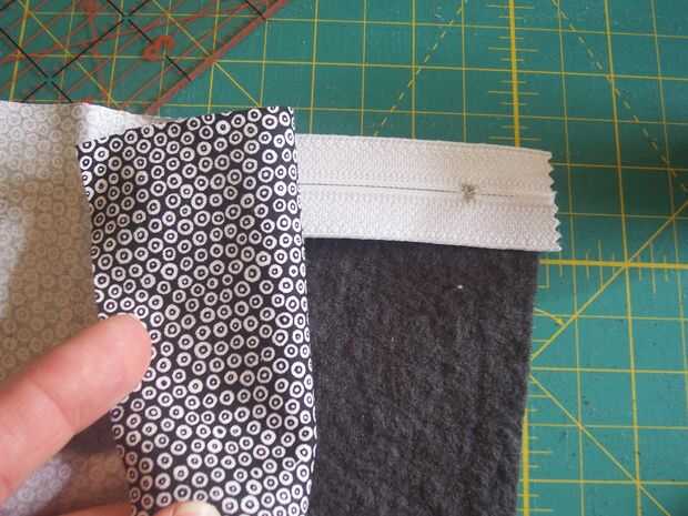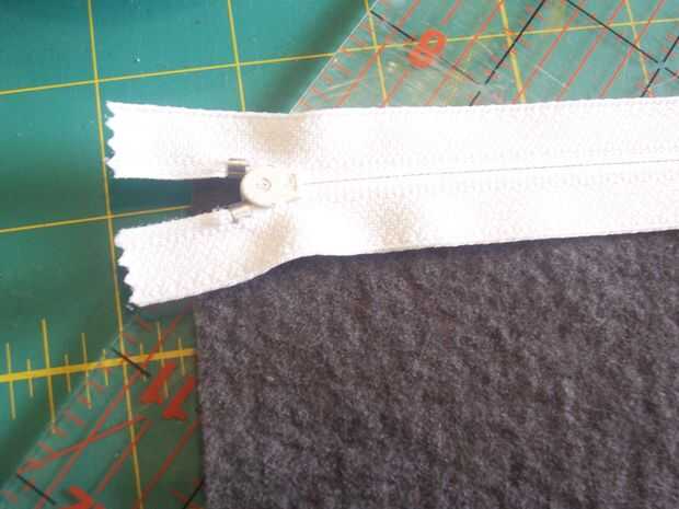 Pone su cremallera cara abajo en el 12" borde de la tela (gris) exterior (la tela debe ser cara para arriba). Posición para el borde de la tela y el borde de la cremallera hacia arriba con la cremallera en la tela gris (ver foto).