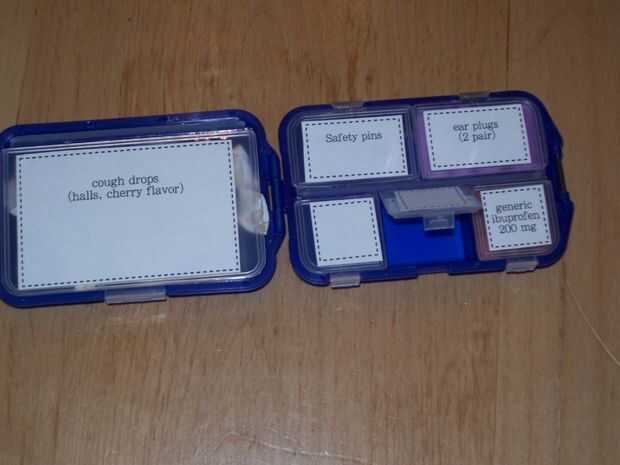 He encontrado la mayoría de mis suministros de primeros auxilios en Wal-Mart, muchos de ellos en la sección de viajes. Lo mejor fue estos casos píldora plástica pequeña, de $0,50. PERFECTO para asprin, tapones para los oídos, tos gotas y similares. Me hicieron poco las etiquetas en el equipo e impreso en papel de etiquetas adhesivas. Podría pegar trozos de papel de etiquetas adhesivas y escriba en él o sólo tienes que escribir en cada sección con un rotulador. Usted quiere algún medicamento bien etiquetados y fuera del alcance de los niños. Las cajas de la píldora no son a prueba de niños.