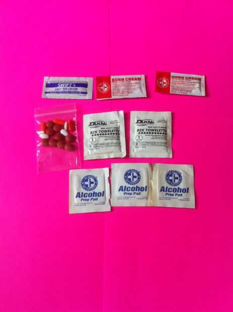 Sección incluye: crema de primeros auxilios (x 1) crema quema (x 2) Bzk Towelette (x2) surtido de medicamentos (x1) Alcohol Prep Pad (x3)