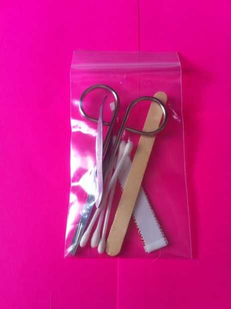 lo que usted necesita:Lineas de pescaPeróxido de hidrógenoBolas de algodónQ-TipsNavaja de bolsilloAguja de coserCuritasLa línea de pesca es para coser heridas con la aguja de coser. Peróxido de hidrógeno limpia cortes y sale la suciedad. Bolas de alg