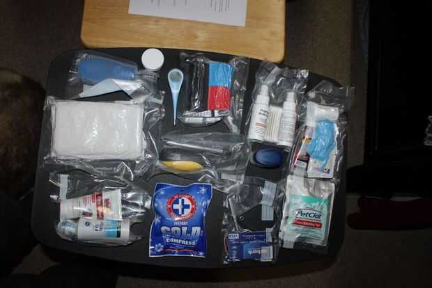 Gasas absorbentes, cinta adhesiva, toallitas antisépticas, loción, polvo o aerosol, manta (una hoja emergencia), bolas de algodón o esponjas, rollos de gasa, peróxido de hidrógeno (para inducir el vómito, hacer esto sólo cuando dirigido por un veterinario o un experto de control de envenenamiento), paquete de hielo, guantes desechables sin látex, vaselina (para lubricar el termómetro), termómetro Rectal (temperatura de su mascota no debe elevarse por encima de 103° F o inferiores a 100° F) , Tijeras (con extremos embotados), almohadillas de gasa estéril no adherente para vendajes, solución salina estéril (se vende en farmacias), pinzas, una funda de almohada a encerrar a su gato para el tratamiento, difenhidramina (Benadryl®), si es aprobado por un médico veterinario para las reacciones alérgicas. Un veterinario debe decirte la dosis correcta para el tamaño de su mascota. Solución de limpieza de oído, caducado o tarjetas de crédito muestra (desde correo directo ofertas de tarjeta de crédito) a los aguijones de insectos lejos de rascado, pasta de glucosa o jarabe de maíz (para perros diabéticos o aquellos con bajo azúcar en la sangre), clavo clippers, sin receta ungüento antibiótico, linterna o linterna, plástico cuentagotas o jeringa, frotamiento alcohol (isopropílico) para limpiar el termómetro, férulas y depresores de lengüeta, polvo hemostático o lápiz (se vende en hospitales veterinarios suministro de pet stores y su farmacia local) etiqueta de identificación temporal (para poner su información de contacto local en el collar de tu mascota cuando viaja), toallas y alicates de punta de aguja.