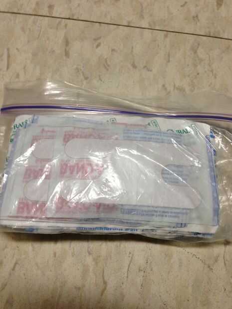 Son muy importantes porque se utilizan para cortes menores y tienen numerosas formas y tamaños. Los que he incluido son: pequeño, normal, grande, punta de los dedos, nudillos, mariposa y gasa. También llevo pastillas preparación alcohol para heridas limpias, que pueden ser recogidas después de una comida en un restaurante. Alas pone especialmente, y Quaker Steak & Lube generosamente les dan hacia fuera.