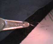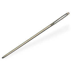 Si no puede encontrar manualmente una aguja con un ojo suficientemente grande para pasarlo (esto toma un poco de práctica), se puede utilizar un enhebrador de agujas como en la imagen. Es una pieza de aluminio con un lazo de alambre de acero muy fino del resorte que empuja a través del ojo, el hilo es colocado en el lazo y tirar ese bucle hacia atrás por el ojo y tira el hilo a través de ese ojo con él.
