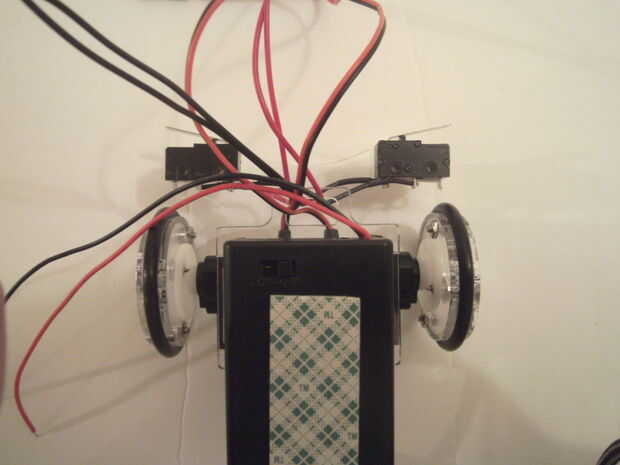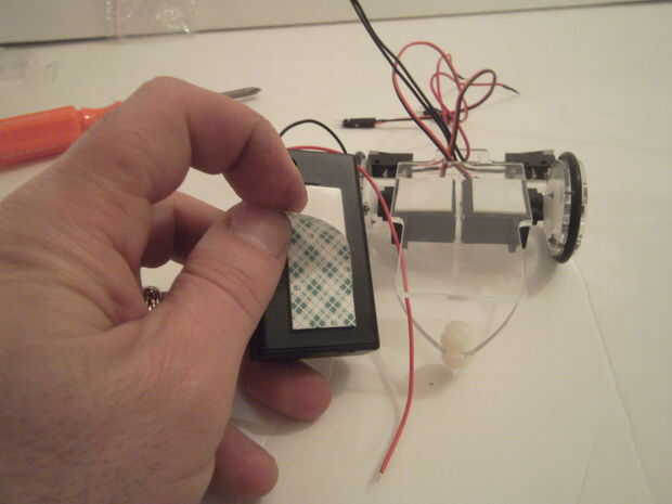 Posiiton la batería pack en la parte superior del robot para que el interruptor y los cables están al frente del robot, y hay suficiente espacio para los cables que pasan hacia arriba a través de la cubierta superior. Presione suavemente la caja de la batería en su lugar en la parte superior del robot.