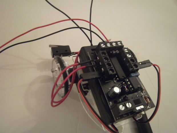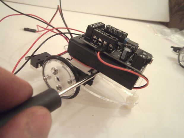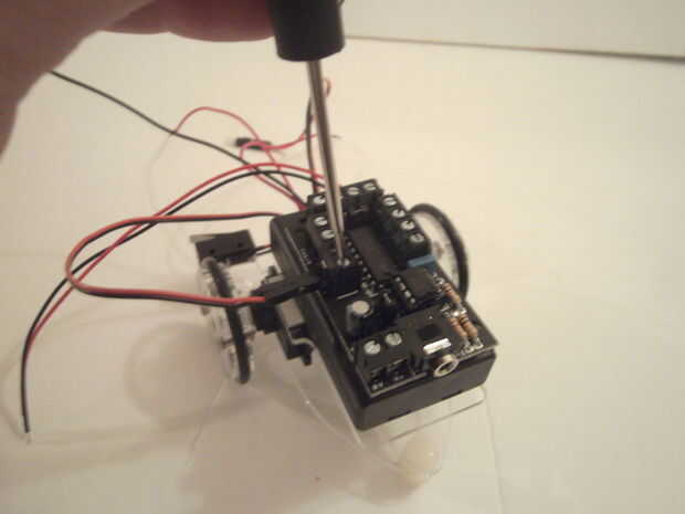 Encontrar los dos cables del motor izquierda y unirlos con los dos bloques de terminales en el lado izquierdo de la tarjeta motor de etiquetado como 0 y 1. Asegúrese de que tener los cables del motor correcta. El cable rojo debe colocarse en la parte trasera, a la terminal marcada 1. El cable negro se conecta a la terminal marcada 0. Utilice un pequeño destornillador plano para apretar los tornillos en las clavijas.