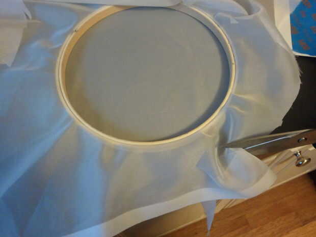 1. Ponga a la tela en el aro y corte con tijeras. Dejar una o dos pulgadas de exceso que se pega fuera del ring.