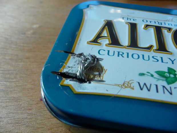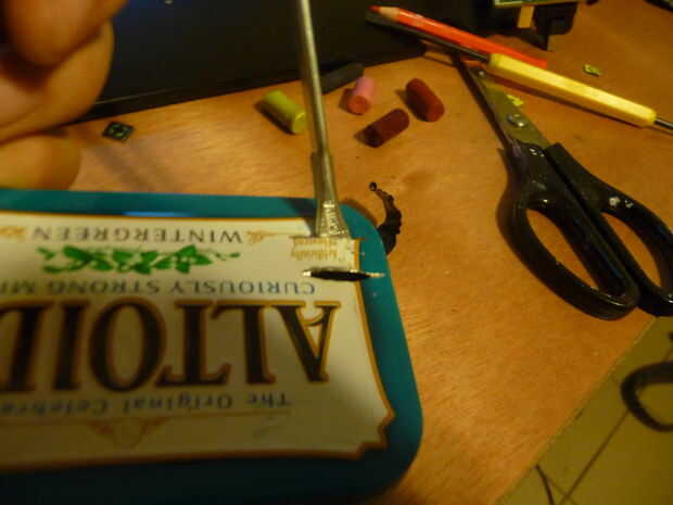 Fije el clip de la tapa, preferentemente Soldándola. Si, como yo, no tienes los medios en cuanto a lo de la soldadura, sólo tira de un puente de alambre y utilizar un conjunto de pinzas para sujetar el clip en su lugar.
