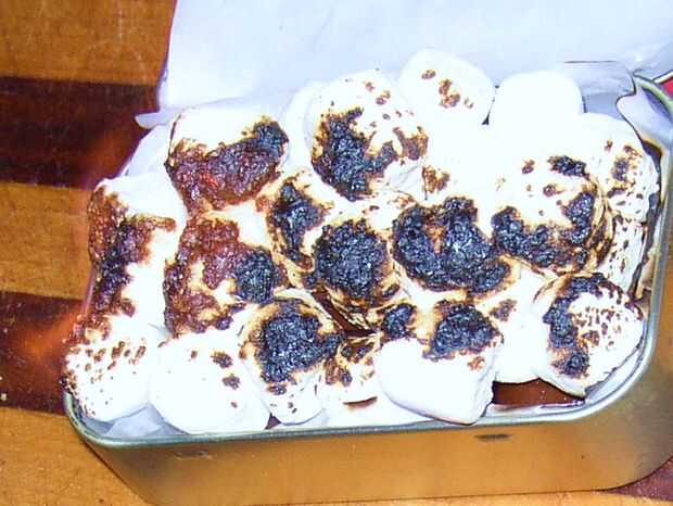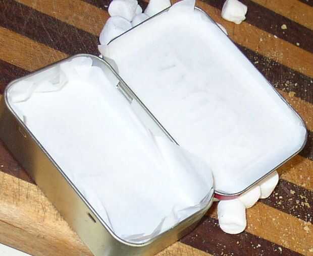 En cualquier caso es seguro traer sonrisas y sonrisas de s ' More! Parrilla en! Es apenas el tamaño correcto para uno, por lo que aportan dos! Para compartir! Todo lo que necesitas es una lata, papel pergamino o papel de aluminio, galletas, cuadrados de chocolate, mini malvaviscos, una estufa de lata Altoids o parrilla, bolsillo caliente u otra fuente de calor.