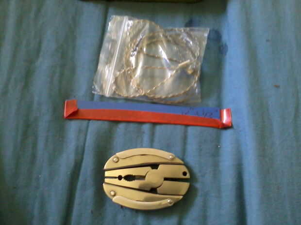 una sección de la hoja de sierra corta, una sierra de alambre y una pequeña multiherramienta.