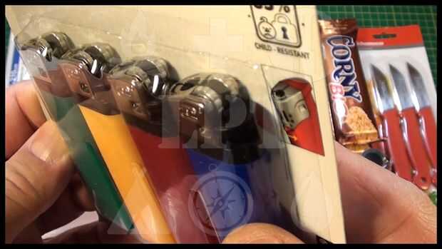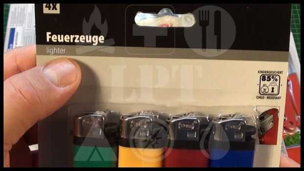 Decidí usar cuatro alumbradores de gas regulares rueda y pedernal simplemente porque son fáciles de usar, el precio de paquete me da con contingencias & copia de seguridad de encendedores. Incluso cuando vacíe el pedernal y rueda produce chispas que pueden usarse para encender la yesca.