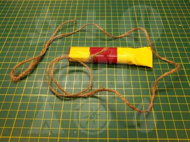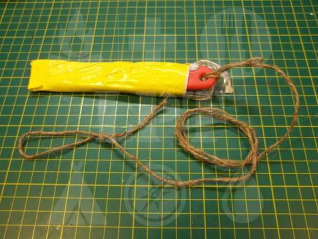 Con el plástico de embalaje y alguna cinta hice una simple funda de los cuchillos de cocina por lo que realmente pude poner en mi bolsillo. Otro pedazo de cuerda también previene este artículo contra la pérdida.