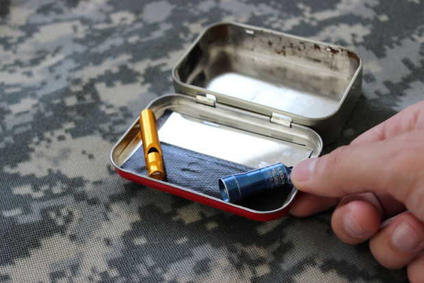 El tiempo en día o noche, estos artículos [espejo, linterna y silbato] reforzará sus posibilidades de ser visto y oído.  El espejo está situado en la parte superior de la lata para un acceso rápido y el silbato y linterna pueden acoplarse a un improvisado collar mediante el uso de la seda dental.
