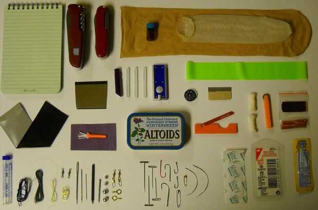 Así, en el Kit... Mi filosofía de la lata es que en situaciones de supervivencia más, se tratan de los elementos críticos con lesiones mortales u otras condiciones médicas, proporcionando refugio para al menos una noche y que rescató. Debido a su utilidad para proporcionar calor, luz y humo (es decir, para señalizar salvadores), fabricación de fuego es también muy útil. Tabletas de purificación de agua, son compactas, por lo que los que se incluyen, como es un sistema minimalista-depósito de agua. Recolección de comida es de poca utilidad en una situación de supervivencia duran sólo un día o dos, pero puesto que unos anzuelos y un sedal agregan poco peso y volumen, he incluido aquellos, así como algunos otros pertrechos de pesca y algunos que podría utilizarse para crear unos lazos de alambre.
