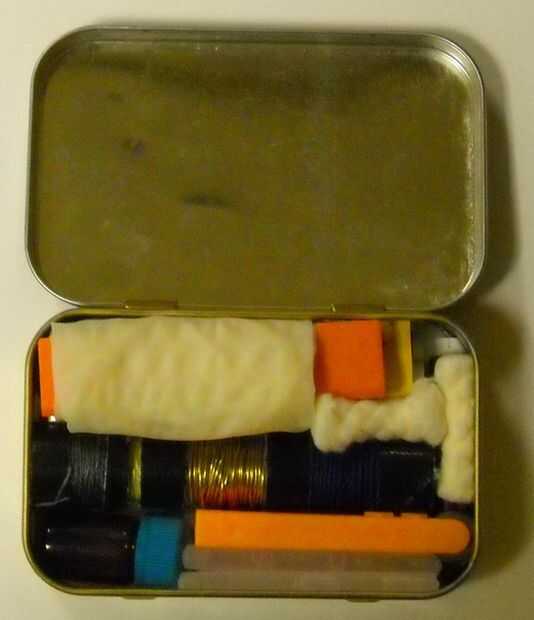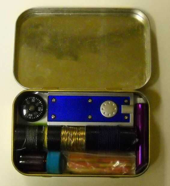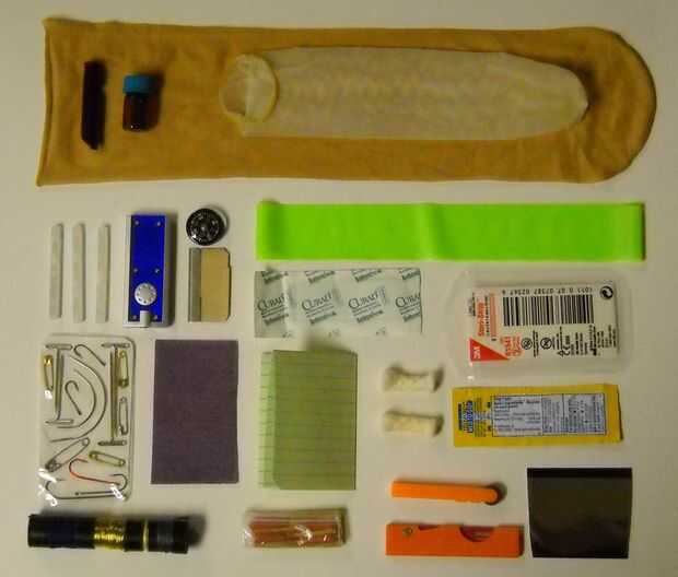 Para la siguiente capa, empacar el "carrete", frasco de cristal, fósforos, silbato, linterna y brújula, en el punto de que parece cuadro 5. El pedernal rueda y mini glow-sticks ir encima de los partidos, el Neosporin y hoja de afeitar sobre la linterna y brújula, y luego el condón consigue envuelto cuidadosamente alrededor de la sierra (no tiene ningunos filos expuestos cuando está doblado) y va de eso, hasta parece que el cuadro 6.
