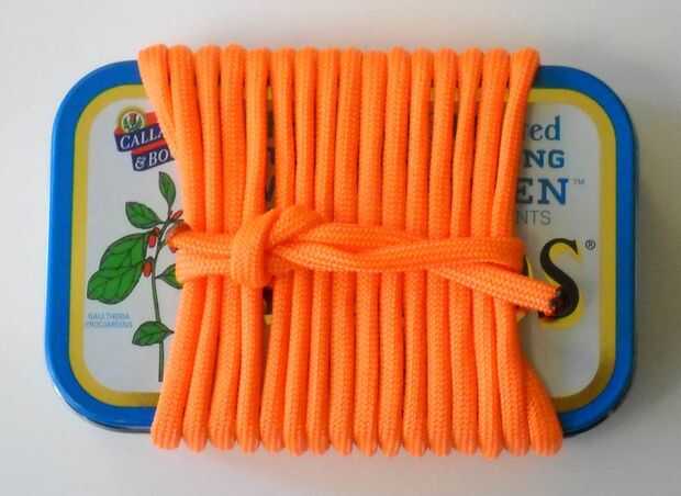 Envolver el juego en 10 pies de paracord ofrece mucho más material para la construcción de vivienda y otros usa y añade sólo unas onzas. El mio es naranja brillante. El estaño envuelto se muestra en el cuadro 7.