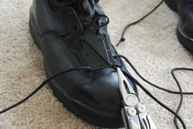 Ate para arriba el otro zapato con el cuchillo de la bota, algunos eyelits en cuchillos de arranque puede ser pequeña así que sea paciente atravesando el paracord.  Esta era la parte más tediosa de este kit para mi.